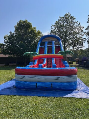 Turn your event into a tropical adventure with the Baja Water Slide! This brightly colored inflatable features dual racing lanes with a center climb leading all the way to the top. Riders can race side by side down the thrilling slide and splash into the refreshing pool at the bottom. With fun palm tree accents and a bold tropical design, it’s perfect for backyard parties, school events, or summer celebrations.